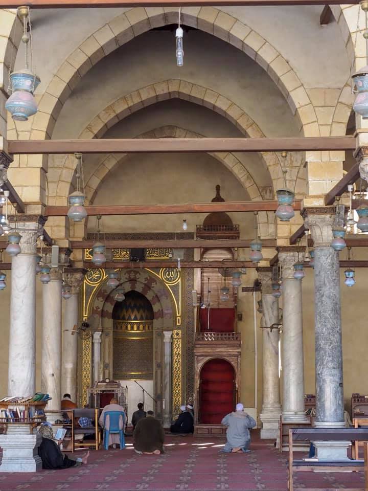 ภายในมัสยิดนี้เป็นโครงสร้างสไตล์อิสลามที่งดงามมากที่สุดในไคโร แม้หลายคนจะคิกว่าด้านในค่อนข้างมืด เพราะแบ่งเป็นหลายชั้นมากจากการใช้ฉากกั้น สำหรับชาวอิสลามการได้ละมาดพร้อมกันยิ่งเยอะ ยิ่งถือเป็นบุญมาก ฉะนั้นเราจึงเห็นว่าตามมัสยิดจะเหลือที่ส่วนกลางเป็นลานโล่งๆ และลดความแออัดด้วยการใช้เพดานสูง